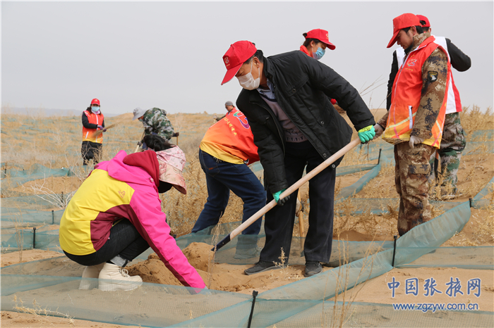 治沙現場,一個個頭戴小紅帽,身穿紅馬夾和白馬夾的身影格外引人注目,該縣新時代文明實踐所組織青年志愿者們也進行義務治沙,為茫茫沙漠增添一片新綠。“作為一名新時代文明實踐志愿者,我很高興能參加今天的壓沙治沙活動,為生態文明建設作出應有的貢獻,我志愿,我參與,我快樂。”新時代文明志愿者蘭玉說。