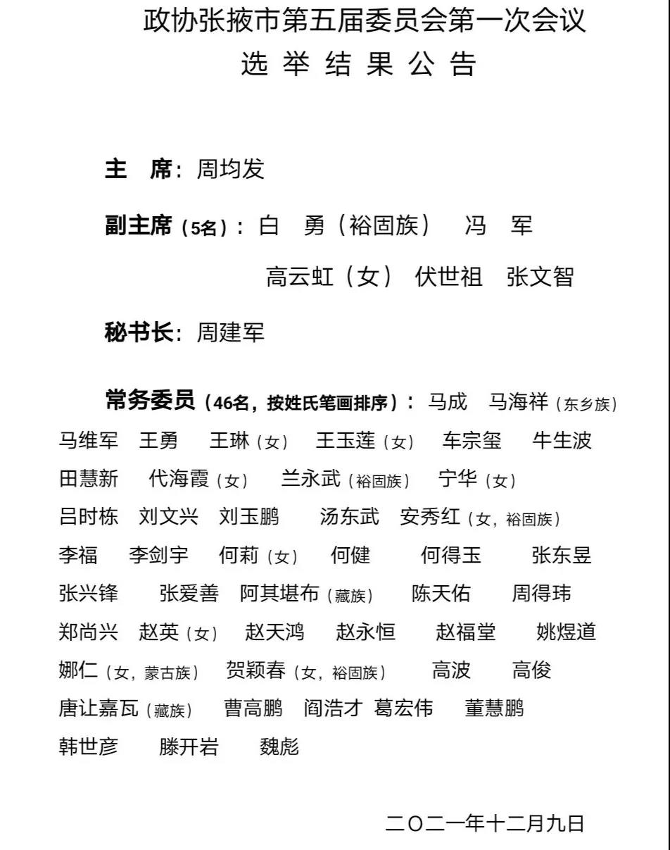 【聚焦張掖兩會(huì)】政協(xié)張掖市第五屆委員會(huì)第一次會(huì)議選舉結(jié)果公告