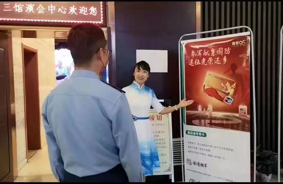 活動現場,擺放農行“濃情擁軍·伴您前行”系列產品海報、展架,播放農行企業形象宣傳片,由農行員工擔任禮儀,向參會人員介紹農行“濃情擁軍”專屬金融產品,組織部分轉業退役軍人員工組成觀眾方陣,充分宣傳和展示了農行擁軍優屬的良好社會形象,進一步密切了銀政、軍銀合作關系。