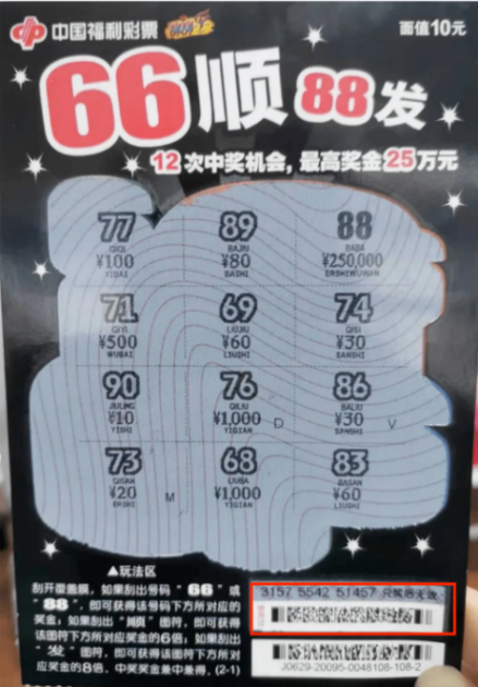 福彩即開票“66順88發”(面值10元)